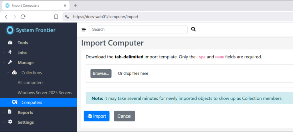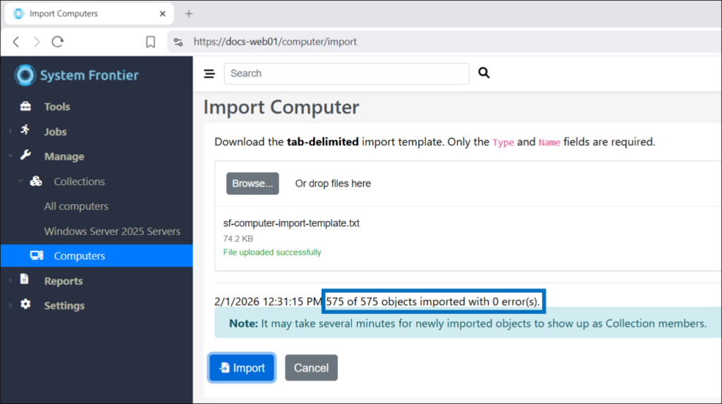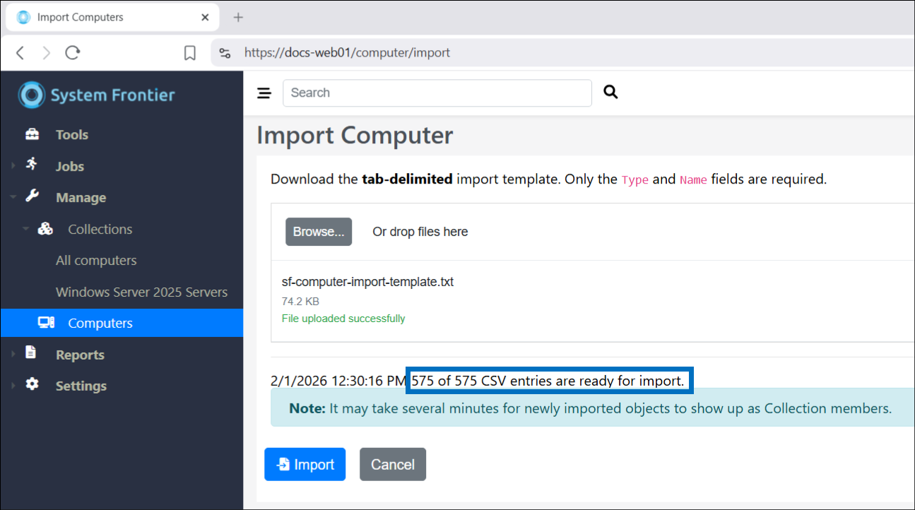 To begin, navigate to Manage > Computers then click Import.